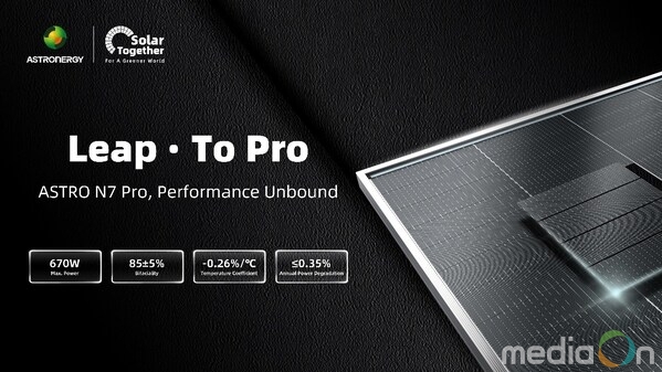 미디어온 관리자 기자 | 항저우, 중국 2026년 1월 9일 -- 아스트로너지(Astronergy)가 1월 7일 전력 산출량과 효율, 장기 시스템 가치의 새 기준이 될 차세대 태양광 모듈 ASTRO N7 Pro를 공식 출시했다. 최대 670W 출력과 24.8%의 최고 효율을 자랑하는 ASTRO N7 Pro는 전 세계 발전소와 C&I 분산형 태양광 프로젝트에서 급변하고 있는 수요에 대응하기 위한 제품이다.