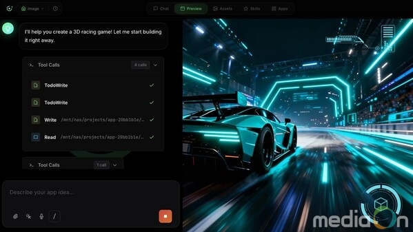 - 각종 콘텐츠 생성: 단 한 줄의 프롬프트만 입력하면 이미지, 동영상, 음악, 게임을 비롯해 다양한 유형의 콘텐츠가 생성된다. 예를 들어 'a futuristic 3D racing game(미래형 3D 레이싱 게임)'이라고 입력하면 게임 장면, 음악, 코드, 영상이 하나의 워크스페이스에 한꺼번에 생성된다.