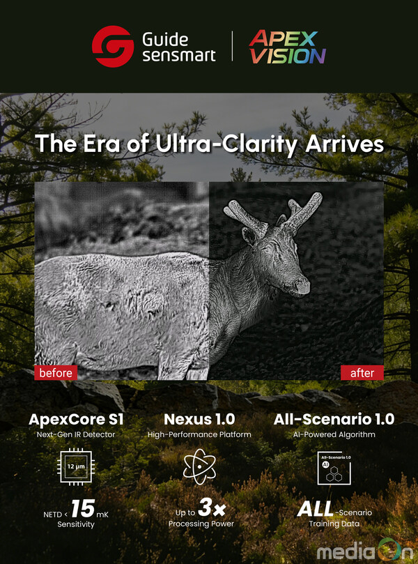 미디어온 관리자 기자 | 라스베이거스 2026년 1월11일 -- 열화상 기술 분야의 글로벌 선도기업 가이드 센스마트(Guide Sensmart)(센트럴 홀, 21740번 부스)가 차세대 열화상 혁신 기술 ApexVision의 공식 출시와 함께 해당 기술이 적용된 신제품 라인업을 함께 공개했다. 가이드 센스마트는 이번 출시를 계기로 단순한 '열 탐지' 단계에서 '선명하고, 정밀하고, 지능적인 탐지' 단계로 이어지는 산업 전반의 도약과 더불어, 울트라 클라리티(Ultra-Clarity)로 정의되는 새로운 시대의 개막을 알렸다