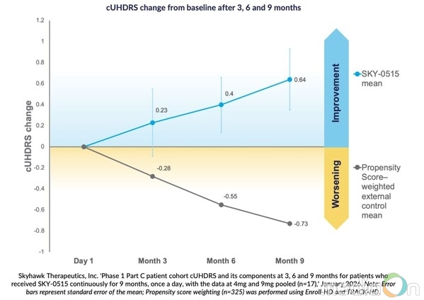 제1상 임상시험 파트 C 환자 코호트에서 SKY-0515를 투여받은 환자들은 3개월, 6개월, 9개월 차에 기저치 대비 평균 복합 통합 헌팅턴병 등급 척도(Composite Unified Huntington's Disease Rating Scale, cUHDRS)의 개선을 보였다. 9개월 차 통합 분석에서 확인된 개선 수치는 +0.64점으로, 이는 Enroll-HD 및 TRACK-HD를 활용한 성향 점수 가중치 기준 증상 발현 환자의 9개월 예상 악화 수치인 -0.73점과 비교되는 수치다.