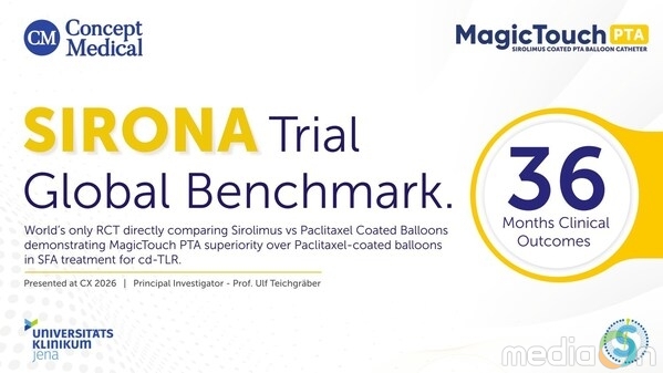 런던, 2026년 4월 28일 -- 콘셉트 메디컬(Concept Medical Inc.)이 4월 27일, 채링 크로스(Charing Cross, CX) 심포지엄 2026에서 시로나(SIRONA) 무작위배정 임상시험의 예비 3년 추적 관찰 데이터 발표를 통해 말초 중재술을 위한 약물 전달 기술 분야에서의 리더십을 강화했다고 발표했다.