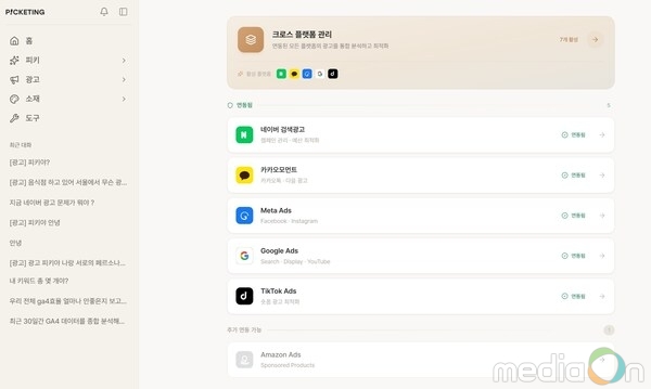 픽켓팅의 주력 AI에이전트 'PICKY(피키)'는 강화학습(Reinforcement Learning) 기반 멀티채널 광고 자동화 플랫폼이다. 네이버, 메타, 구글, 카카오 등 주요 광고 채널을 단일 대시보드로 통합 운영하며, AI가 실시간으로 예산을 재분배하고 소재를 최적화한다. 광고 운영 경험이 없는 초기 창업자도 복잡한 세팅 없이 즉시 광고를 시작할 수 있도록 설계된 것이 가장 큰 특징이다.